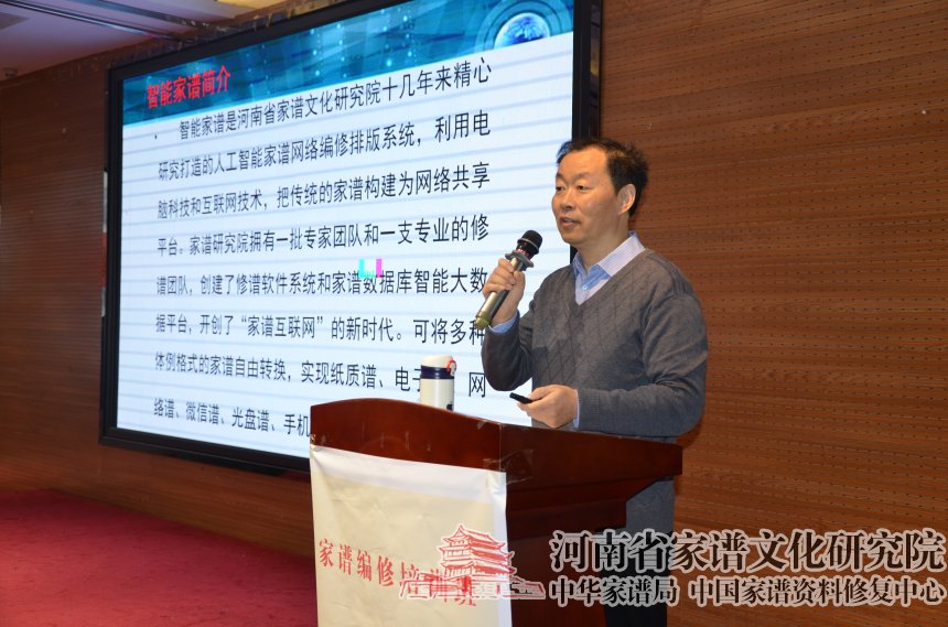 11月29日上午,河南省家谱文化研究院副院长金涛向与会者介绍了智能家谱编修软件的情况。